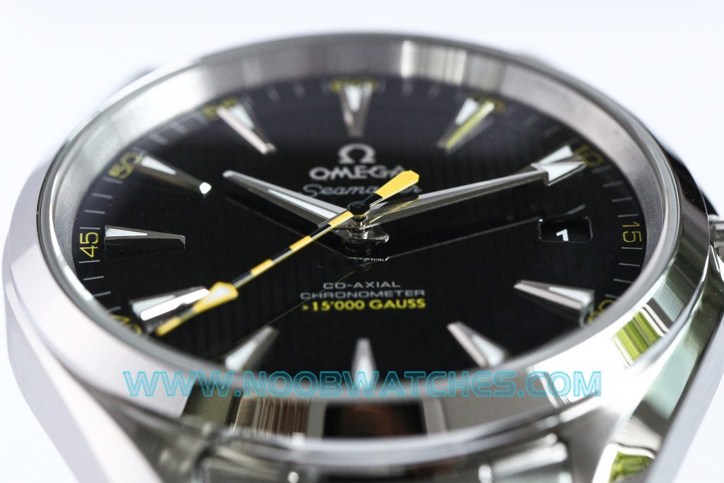 VS厂欧米茄海马系列大黄蜂腕表的直径与原装正品完全一致都是41.5MM,厚度也是13MM!腕表表盘采用了柚木纹理装饰的黑色表盘,外圈刻度以及秒针都是采用黄色为主色的设计!搭配着非常通透的蓝宝石玻璃镜面,不管在那个角度读取时间都非常容易!(当然这个角度不能太过分了)表盘三点钟位置的窗口日历不管是大小还是日历字体都完美还原!可将VS对这款腕表的用心程度!