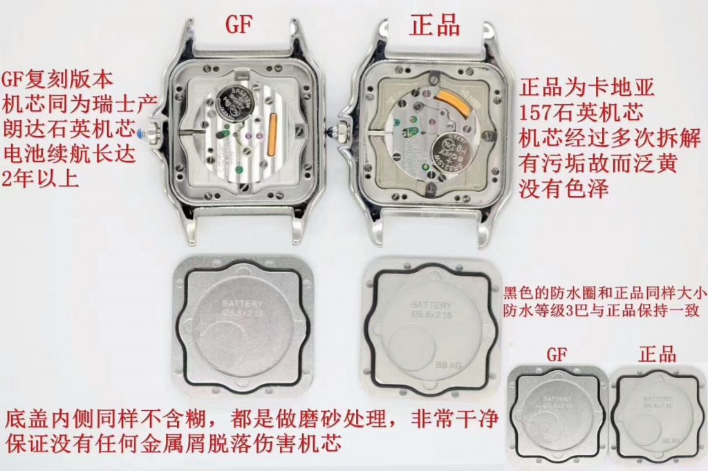 GF厂复版本底盖内侧不含糊体,做的和正品一样,经过磨砂处理,非常干净,保证不会有任何金属屑脱落伤害机芯,黑色的防水圈与正品尺寸相同,防水等级3巴,电池寿命长达2年,GF厂复版机芯与正品相同,电池寿命长达2年。(注:正品机芯经多次拆装有污垢,因而泛黄无光泽)