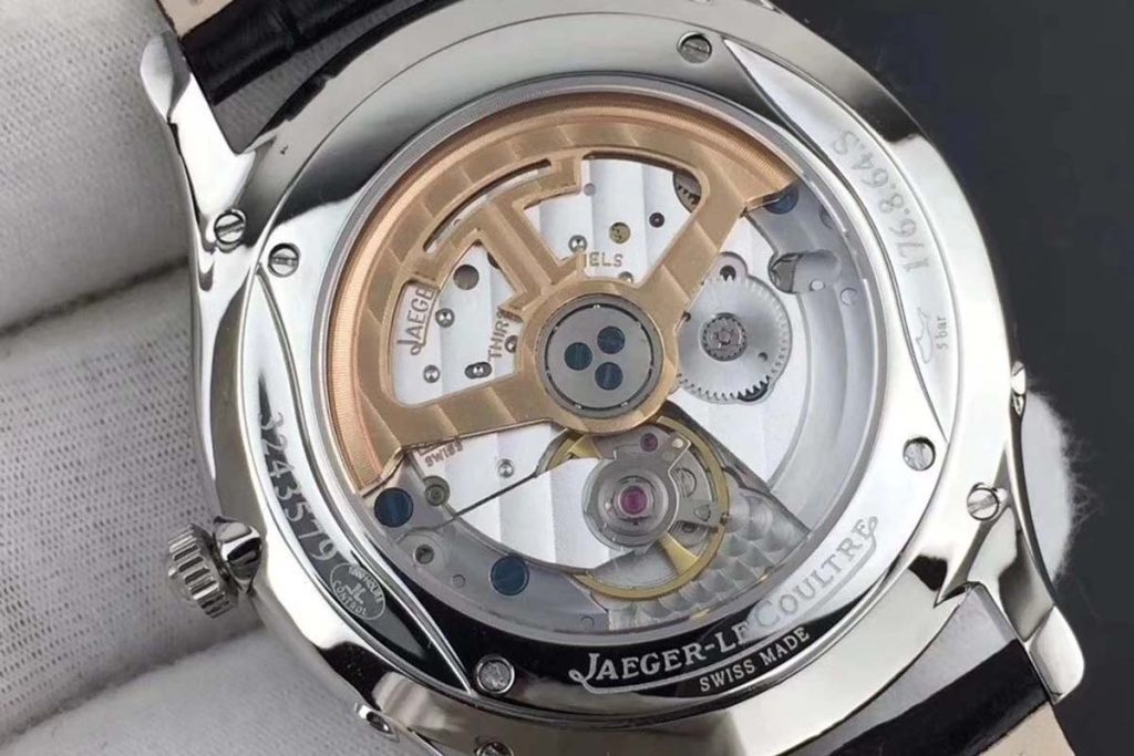 腕表的机芯选用西铁城9015改造同步积家Cal.925/1自动上链机械机芯,机芯的出色功能和精准走时。机芯具有253个部件,厚度仅有4.9毫米,动力贮藏约为38小时。机芯的噪声大大减少。ZF积家月相这款腕表选用背透规划,底盖上的刻字刻的也是整齐清楚的。透过底盖能够查询机芯的运作,还是非不错的!