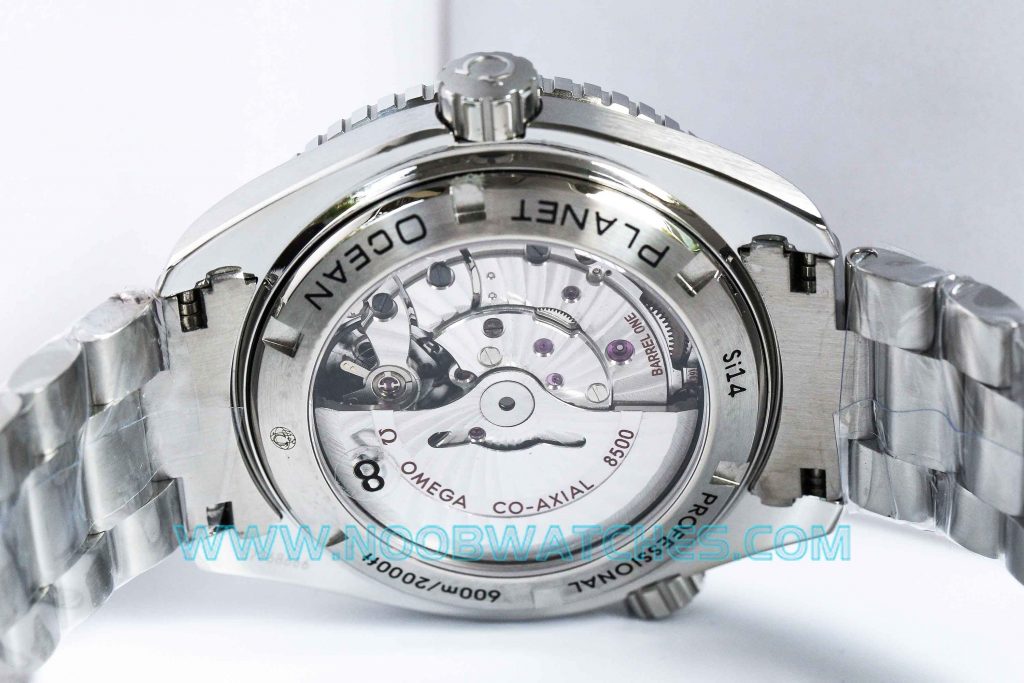 背面采用背透设计,底盖周围的精钢经抛光打磨十分闪亮、刻字清晰工整。透过中间蓝宝石水晶玻璃,让内中机芯的精美细节一览无遗。此款机芯搭载VS厂自研8500一体机芯,一体化的机芯不再是之前覆盖夹板的形式,性能更加稳定,功能外观与原版一致,完全实现时针单独调历的功能。是目前欧米茄碟飞、海马150米、300米、600米款式最好的复刻机芯。
