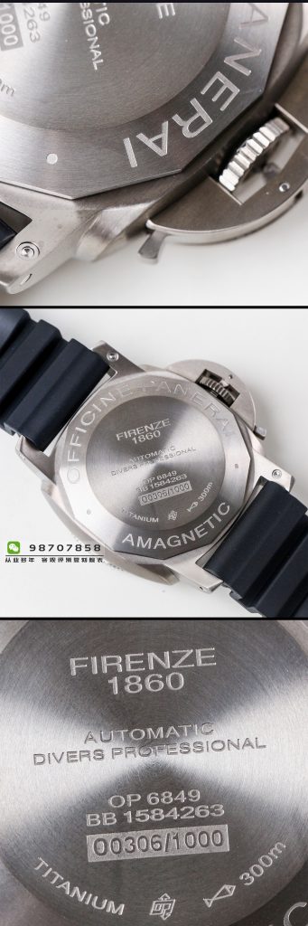 背面是密封底设计,采用双底盖与原版保持一致,妨磁效果非常好。底盖上的刻字非常用心,可见厂家的专注态度,机芯采用p.9000自动上链机芯,注意vs最新升级版pam389时针可以单独调整和原版一致。